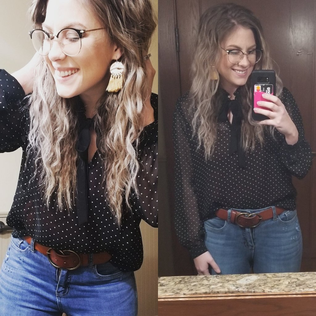 Well I am posting this outfit one day late! Yesterday was insane. So anyways I’ll start by saying I do shower eveyday but obviously I don’t wash my hair every day. Well Thursday was a crazy day and all i could think about was a hot shower so I took one that night and even washed my hair. So because I can’t just blow dry it and go to bed because the next day it will be flatter than the plains. I did two Dutch braids . Which means the braids gets pulled under instead of over. The trick is to wait until your hair is ALMOST dry. You can still feel its damp but not yet dry. Put on some smoothing gloss, I use Kenra, and braid them! That way the next day you just do your routine then pop those babies out fluff it and spray it with some texture spray! I prefer joico. I wore my TJ Maxx shirt and my awesome walmart Jean’s! The belt I have on is from ‘Charis Clothing by Kelsey’. You can find her on facebook!